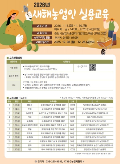 [뉴스앤톡] 춘천시가 내년 농업 현장에서 필요한 신기술을 집중 교육하는 2026년 새해농업인실용교육을 운영한다.