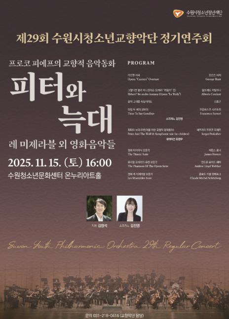 [뉴스앤톡] 수원시청소년청년재단 수원청소년문화센터에서는 오는 11월 15일 오후4시, 온누리아트홀에서 제29회 정기연주회를 개최한다. 이번 연주회는 ‘프로코 피에프의 교향적 음악동화 '피터와 늑대'’를 중심으로, 세대를 아우르는 감동의 영화음악을 함께 선보이며 청소년 단원들의 풍성한 음악적 성장을 보여줄 예정이다.