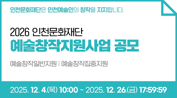 [뉴스앤톡] 인천문화재단은 오는 12월 2026 예술창작지원사업 공모를 시작한다. 공모 분야는 예술창작일반지원, 예술창작집중지원으로 두 가지이다. 접수기간은 2025년 12월 4일부터 12월 26일까지이며, 국가문화예술지원시스템으로 온라인 신청을 받는다.