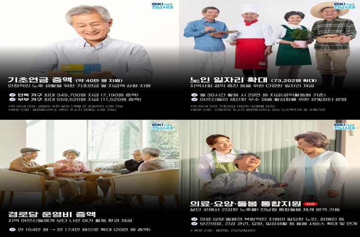 이현숙 전남도 노인복지과장은 “어르신이 살던 곳에서 안전하고 활기찬 노후를 보내도록 어르신 맞춤형 정책을 지속해서 추진하겠다”고 강조했다.