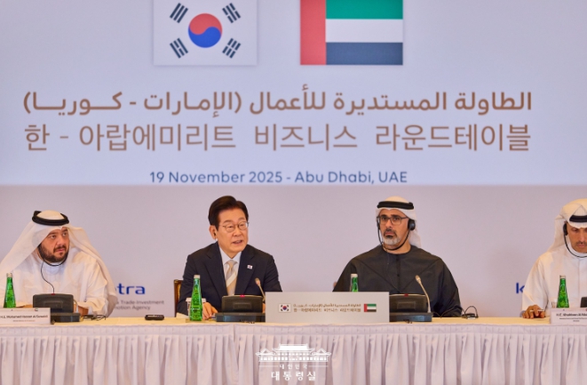 이 대통령은 이날 아부다비 소재 한 호텔에서 열린 '한-UAE 비즈니스 라운드 테이블' 행사에 참석해 양국 정부 및 기업의 교류 확대 필요성을 강조하며 이같이 언급했다.