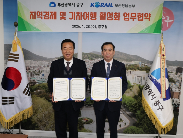 [뉴스앤톡] 부산 중구는 28일 코레일 부산경남본부와 ‘지역경제 및 기차여행 활성화 업무협약’을 체결했다.