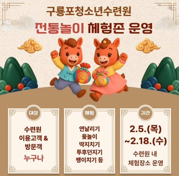 구룡포청소년수련원 관계자는 “명절 기간 수련원을 찾는 청소년과 가족들이 전통놀이를 통해 즐거운 추억을 만들고, 우리 문화의 가치를 자연스럽게 체험할 수 있도록 이번 프로그램을 준비했다”며, “앞으로도 지역사회와 연계한 체험 중심 프로그램을 지속적으로 확대해 나가겠다”고 전했다.