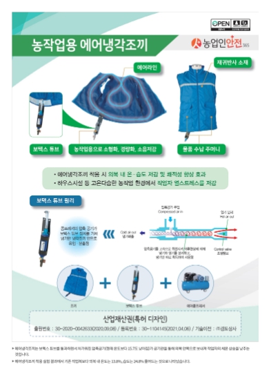 농촌진흥청이 2년간 개발·실증을 거쳐 2020년 산업재산권으로 등록했다. 일반 작업복 대비 신체 내부 온도를 평균 13.8%, 습도를 24.8% 줄이는 효과가 확인돼 열사병과 열탈진 예방에 도움이 되는 것으로 나타났다.