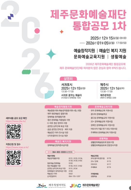 [뉴스앤톡] 제주문화예술재단(이사장 김석윤)은 2026년도 지원사업 1차 통합공모를 실시한다. 접수 기간은 2025년 12월 15일부터 2026년 1월 5일까지이며, 문화예술교육 지원사업은 2026년 1월 9일까지 접수한다.