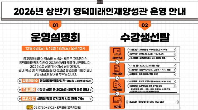 이에 영덕군은 오는 12월 6일과 12월 13일 오전 10시, 두 차례에 걸쳐 운영설명회를 열며, 설명회 당일에는 시설을 전면 개방해 학생과 학부모가 양성관 내부를 직접 둘러볼 수 있도록 할 예정이다.