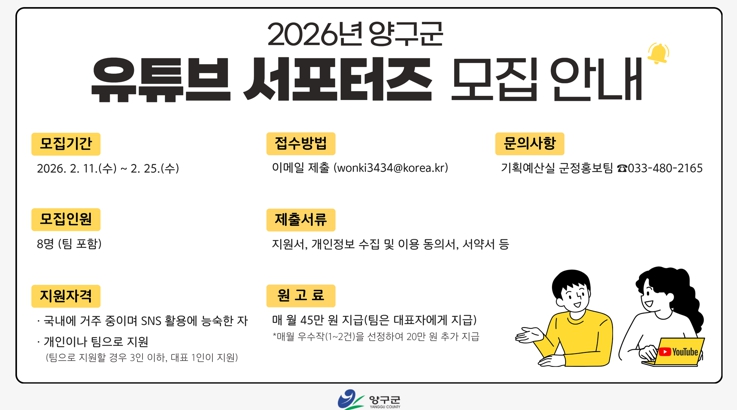서정혁 군정홍보팀장은 “유튜브 서포터즈는 현장에서 직접 보고 느낀 양구의 매력을 영상으로 전달하는 중요한 홍보 파트너”라며 “참신한 시각과 열정을 가진 분들이 참여해 양구의 다양한 이야기를 널리 알려주시길 기대한다”고 말했다.