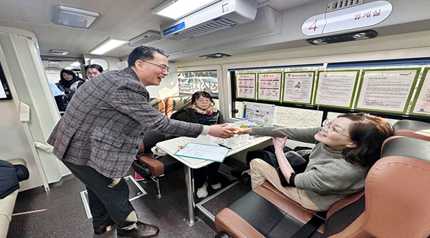 | ▲ 헌혈버스 안(장해윤 이사장 직무대행) |