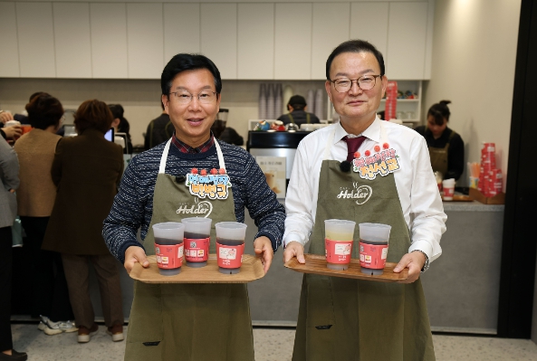[뉴스앤톡] 박병규 광산구청장과 정선교 대명외식산업 대표가 27일 광산구청 1층 모두의 쉼터 조성을 기념해 청각장애인의 자립을 돕는 일터인 구청 내 ‘카페홀더’에서 일일 명예점장 사회공헌활동을 진행했다.