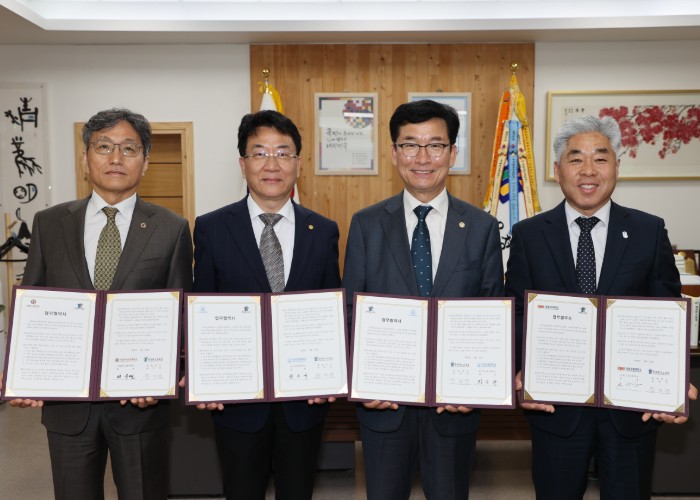| ▲ 왼쪽부터 한국교통대학교 대외협력연구부총장 서수연, 한국교원대학교 총장 차우규, 교육감 윤건영, 충북도립대학교 총장 천범산 |
