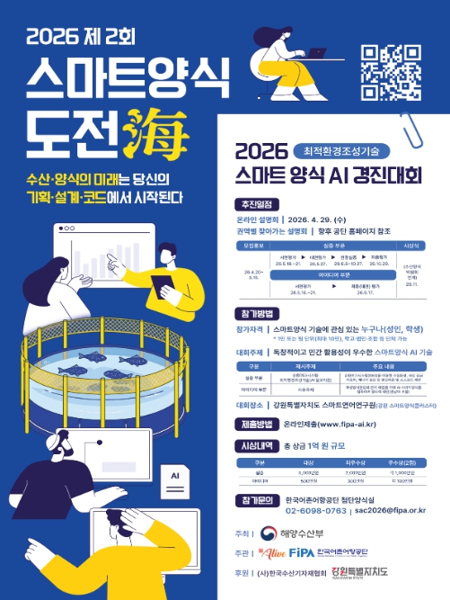 [뉴스앤톡] 해양수산부와 한국어촌어항공단(이사장 홍종욱)은 4월 20일부터 5월 15일까지 ‘제2회 스마트양식 도전해(海) 경진대회’의 공모를 실시한다고 밝혔다.