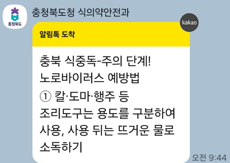 | ▲ 충북도, 식중독 예방 위해 카카오 알림톡 서비스 실시 |