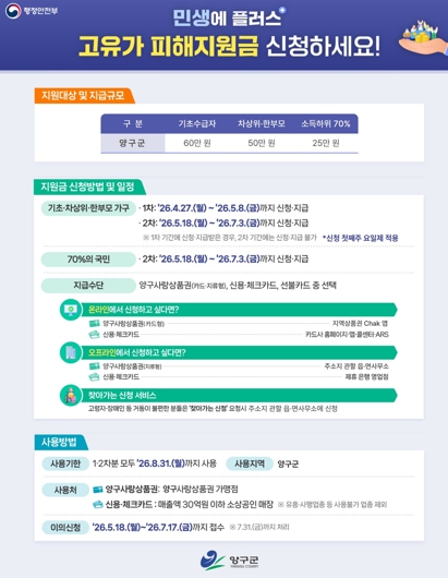 이번 지원은 에너지 가격 상승과 전반적인 물가 인상으로 가계 부담이 크게 증가한 상황에서, 서민층을 보다 두텁게 보호하기 위해 마련된 민생 안정 대책이다. 특히 양구군은 비수도권 및 인구감소지역에 대한 우대 정책이 적용됨에 따라 타 지역보다 상대적으로 높은 수준의 지원 혜택이 제공된다.
