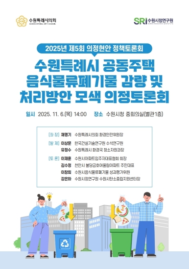 [뉴스앤톡] 수원특례시의회 환경안전위원회는 11월 6일, 오후 2시, 수원시청 별관 1층 중회의실에서 ‘공동주택 음식물류폐기물 감량 및 처리방안 모색을 위한 의정토론회’를 개최한다고 밝혔다.