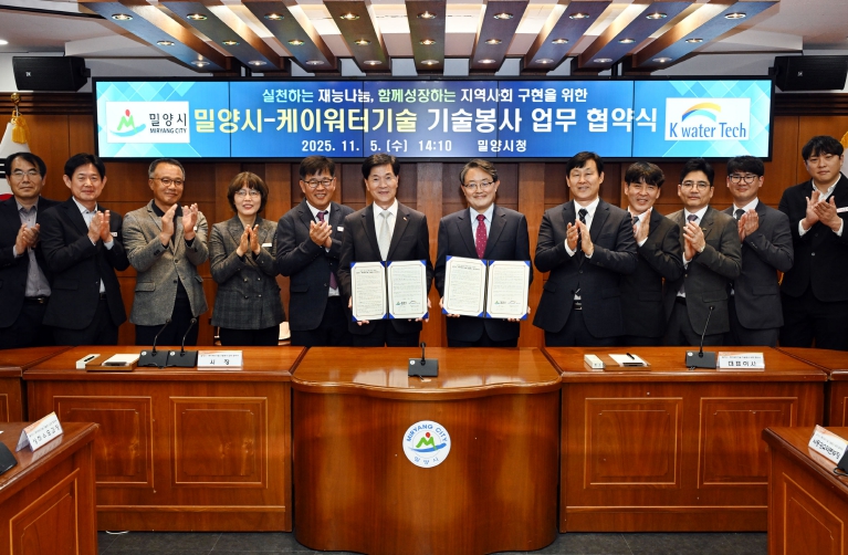 [뉴스앤톡] 경남 밀양시와 케이워터기술(주)(대표 정승용)은 5일 시청 소회의실에서 ‘실천하는 재능나눔, 함께 성장하는 지역사회 구현을 위한 기술봉사 업무협약’을 체결했다고 밝혔다.