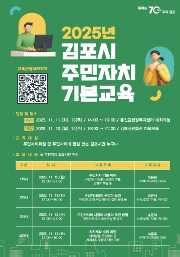 [뉴스앤톡] 김포시는 주민자치위원 및 주민자치에 관심 있는 시민을 대상으로 '2025년 김포시 주민자치 기본 교육'을 오는 11월 10일부터 13일까지 운영한다고 밝혔다.