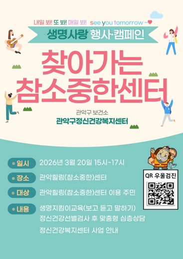 행사는 차 한 잔을 나누는 편안한 분위기 속에서 진행되며, 관악구민이라면 누구나 참여가능하다. 참여 주민들은 ‘우울감 선별검사(PHQ-9)’를 통해 자신의 마음 건강 상태를 면밀히 살피는 시간을 갖는다. 검사 결과에 따라 필요한 경우 전문 상담사의 맞춤형 심층 상담을 즉석에서 제공해 실질적인 도움을 줄 예정이다.