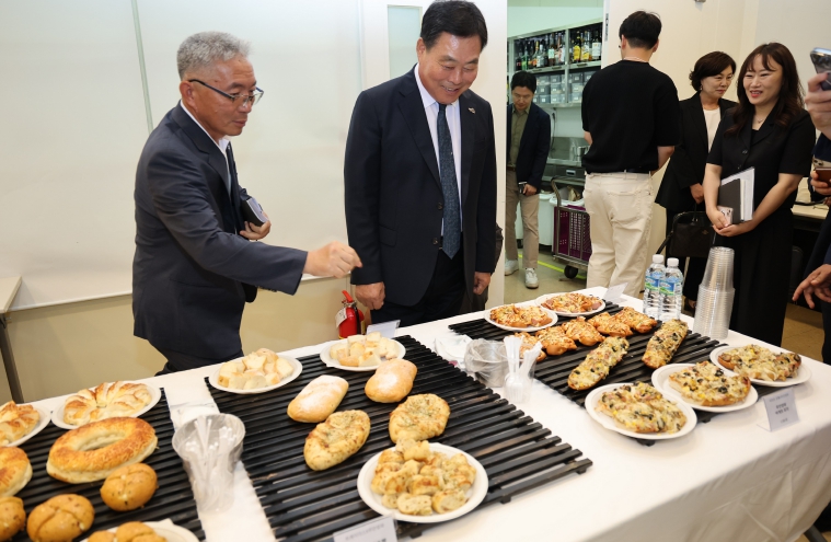 | ▲ 지난 7월 무안군-신세계푸드 협약식에서 무안 양파빵 제품을 살펴보는 김산 군수 |
