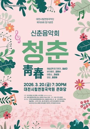 대전시립연정국악단 제199회 정기공연 신춘음악회‘청춘(靑春)’은 국악관현악과 동서양 악기의 협연이 어우러진 풍성한 프로그램을 통해 관객들에게 깊은 울림과 감동을 선사할 것으로 기대된다.