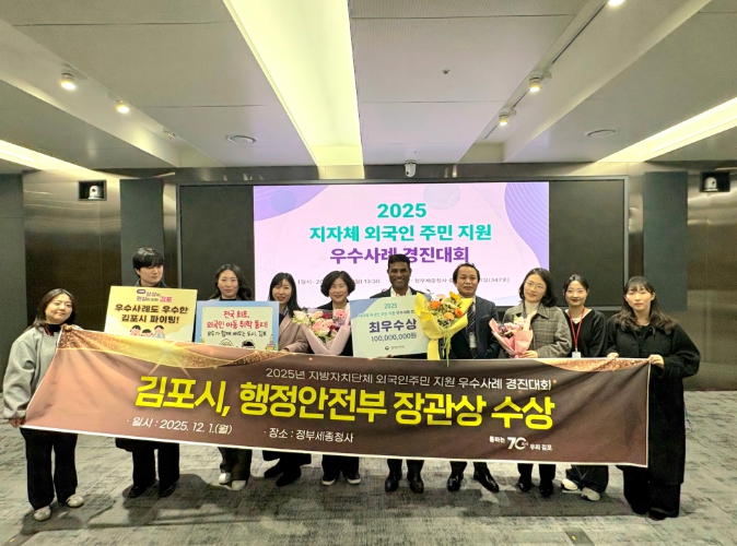 [뉴스앤톡] 김포시가 12월 1일 정부세종청사에서 행정안전부가 주관한 '2025 외국인주민 지원 우수사례 경진대회'에서 최우수상을 수상했다. 이로써 김포시는 특별교부세 1억 원을 지원받게 됐다.