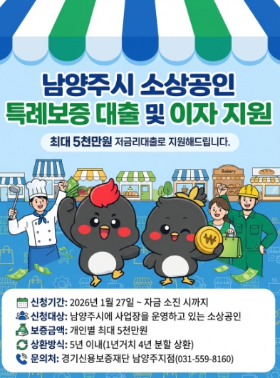 [뉴스앤톡] 남양주시는 관내 소상공인의 자금난 해소와 경영 안정을 도모하기 위해 ‘2026년 소상공인 특례 보증 및 이차보전 지원사업’을 시행한다고 29일 밝혔다.