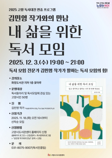 [뉴스앤톡] 고양특례시는 오는 12월 3일 오후 7시, 화정도서관 지하 1층 꽃마루에서 독서모임 분야 전문가인 김민영 작가를 초청해 ‘김민영 작가와의 만남: 내 삶을 위한 독서 모임’프로그램을 운영한다고 밝혔다.