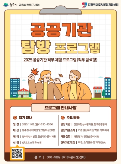 [뉴스앤톡] (재)강원혁신도시발전지원센터는 원주시 교육발전특구 사업의 일환으로, 오는 11월 3일 원주권 내 청년들의 공공기관 진로 탐색 지원하기 위한 ‘2025 공공기관 직무 체험 프로그램(직무 탐색형)_공공기관 탐방’을 운영한다.