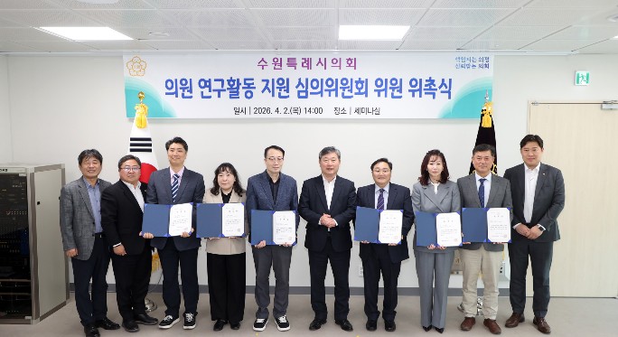 이번 위촉식은 최근 개정된 ‘수원시의회 의원 연구활동 지원 조례’에 따라, 연구 활동의 객관성과 전문성을 한층 높이기 위해 추진됐다. 의회운영위원회의 추천을 받은 행정, 경영, 교육, 도시, 외교 5개 분야의 전문가 6명이 신규 위원으로 선임됐다.