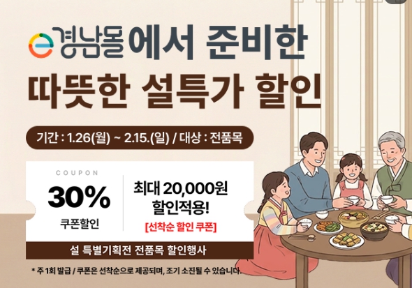 [뉴스앤톡] 경상남도와 (재)경상남도투자경제진흥원이 운영하는 e경남몰은 1월 26일부터 예산 소진 시까지 ‘2026년 풍성한 설맞이 할인 기획전’을 진행한다.