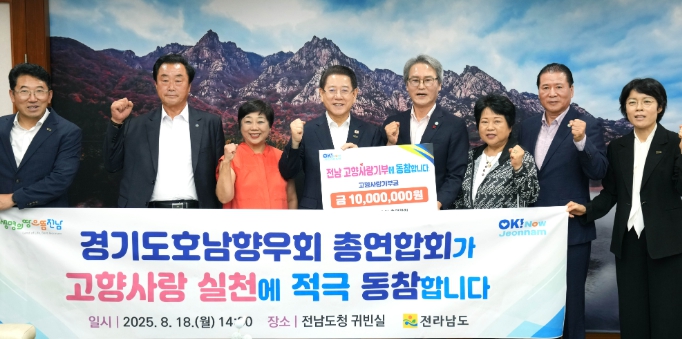 [뉴스앤톡] 전라남도는 고향을 사랑하고 응원하는 출향민의 고향사랑기부제 고액 기부 릴레이 참여가 점차 확산하는 가운데 경기도호남향우회 총연합회(회장 정재형)가 18일 고향사랑기부금 1천만 원을 전남도에 기탁했다고 밝혔다.