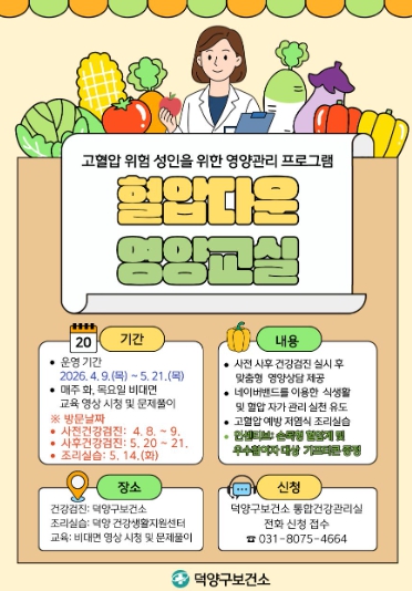 아울러 오는 5월 14일 고혈압 예방을 위한 저염식 조리실습이 덕양건강생활지원센터에서 진행된다. 해당 실습은 선택적 프로그램으로, 올바른 식생활을 직접 체험하고 실천 능력 향상에 도움을 줄 것으로 기대된다.