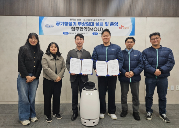 [뉴스앤톡] 화성특례시 효행구가 13일 SK인텔릭스와 ‘공기청정기 무상임대 설치 및 운영 업무협약(MOU)’을 체결하고 청사 내 실내 공기질 개선을 위한 인공지능(AI) 자율주행 공기청정기를 설치했다. 이번 협약은 지난 2월 개청한 효행구청사가 시민들에게 미세먼지 걱정 없는 쾌적한 행정 공간을 제공하기 위해 마련됐다.