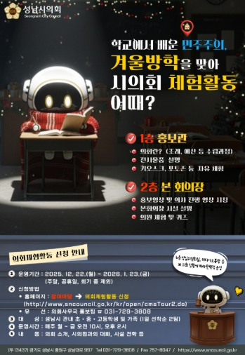 [뉴스앤톡] 성남시의회는 겨울방학을 맞아 관내 초·중·고등학생과 가족을 대상으로‘가족과 함께하는 겨울방학 의회 체험활동’을 오는 12월 22일부터 2026년 1월 23일까지 운영한다.