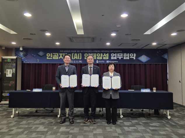 [뉴스앤톡] 제주국제자유도시개발센터는 12월 11일 제주대학교, 제주상공회의소와 함께 도내 인공지능(AI) 전문인재 양성을 위한 업무협약을 체결했다.