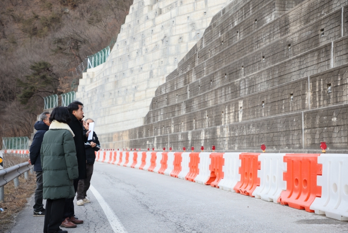 | ▲ 보은 두평지구 사면 보강공사 완료…지방도 575호선 양방향 통행 재개 -현장점검 모습 |