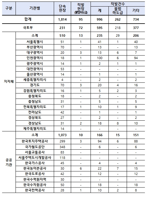 국토교통부(31.2%) 외 지자체(2.6%), 공공기관(1%)의 적발률이 현저히 낮아, 향후 국토교통부 중심의 단속을 강화하고, 지자체 및 공공기관의 불법하도급 단속 및 관리능력 제고를 위해 단속 인력에 대한 교육, 매뉴얼 배포 및 단속지원 등을 강화하고 할 계획이라고 밝혔다.