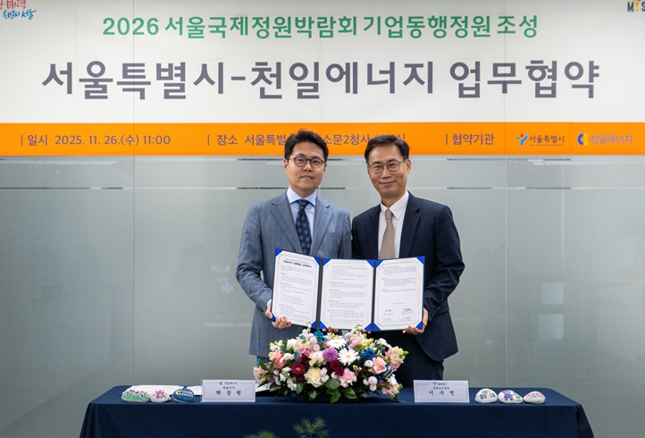 [뉴스앤톡] 서울시는 2026년 서울숲에서 개최되는 서울국제정원박람회 내에 기업동행정원 조성을 위해 ESG 경영에 힘쓰고 있는 천일에너지와 11월 26일 업무협약을 체결했다.