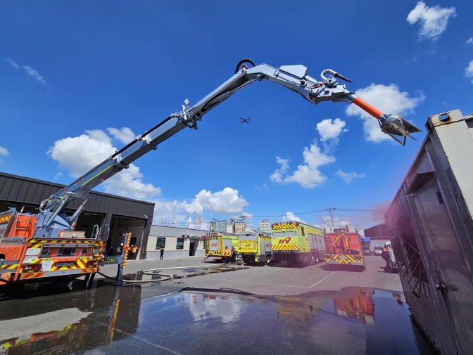 이날 훈련에서는 컨테이너를 활용해 실제 화재 상황을 재현하며 ▲창문 파괴를 통한 수평배연 및 분무방수 ▲천장 파괴를 통한 수직배연 및 분무방수 ▲원격 직사주수에 의한 일제방수 등 주요 기능이 단계별로 선보였다. 사용된 컨테이너는 폭 2.6m, 길이 6m, 높이 2.6m 크기로, 두께 2mm 철판을 적용해 실제 건축물과 유사한 환경을 구현했다.