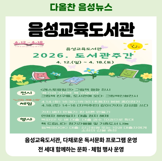[뉴스앤톡] 음성교육도서관은 제62회 도서관주간을 맞아 4월 12일부터 4월 18일까지 ‘도서관 속 작은 펼침, 세상을 여는 큰 열림’을 주제로 유아, 학생, 학조부모 및 지역주민 등 전 연령층이 함께 참여할 수 있는 다양한 독서문화 프로그램을 운영한다.