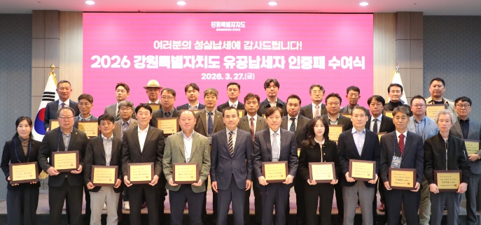 [뉴스앤톡] 강원특별자치도는 3월 27일, 춘천 스카이컨벤션웨딩홀에서 '2026년 지방세 유공납세자 인증패 수여식'을 개최하고, 어려운 경제 여건 속에서도 납세의무를 성실히 이행해 지역발전에 기여한 유공납세자에게 감사의 뜻을 전했다.