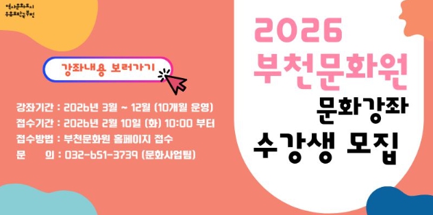 [뉴스앤톡] 부천문화원이 2026년 문화강좌 수강생을 모집한다. 올해로 설립 60주년을 맞은 부천문화원은 지역문화의 기틀을 다져온 공공문화예술기관으로, 시민의 일상 속에서 역사·문화·예술의 기반을 넓혀가고 있다.
