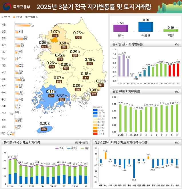 [뉴스앤톡] 국토교통부와 한국부동산원(원장 손태락)은 '25년 3분기 지가변동률 및 토지거래량을 발표했다.
