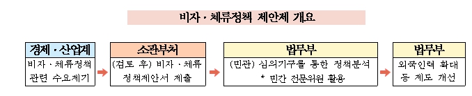 또한 체계적·균형적 심의를 통한 비자정책 결정 체계를 강화하고 정책의 예측가능성을 제고하기 위하여 '비자·체류정책심의위원회'의 설치·운영 근거를 법령에 규정하는 내용의 ‘비자·체류정책제안제 법제화’를 추진할 계획이다.