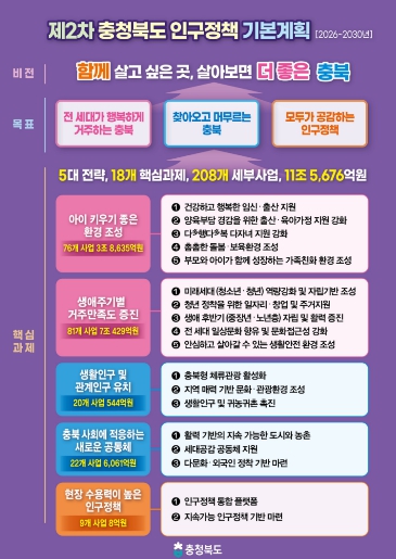 “함께 살고 싶은 곳, 살아보면 더 좋은 충북”을 비전으로, ‣전 세대가 행복하게 거주하는 충북 ‣찾아오고 머무르는 충북 ‣모두가 공감하는 인구정책을 목표로 한다. 이를 위해 5대 전략, 18대 핵심과제, 208개 세부사업을 추진하며, 2030년까지 총 11조 5,676억원을 투입할 예정이다. 이는 1차 기본계획 대비 1조7,536억원이 증액된 규모다.