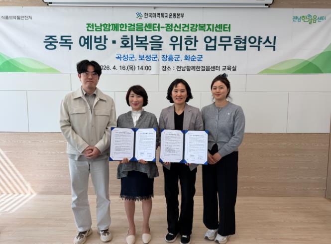 [뉴스앤톡] 화순군은 지난 16일 화순군정신건강복지센터가 전남함께한걸음센터와 지역사회 마약류 및 약물 오남용 예방과 회복 지원 강화를 위한 업무협약(MOU)을 체결했다고 밝혔다.