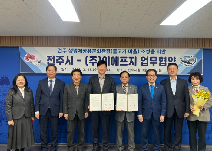시는 18일 시청 3층 소회의실에서 윤동욱 전주 부시장과 류병덕 ㈜이에프지 대표 등이 참석한 가운데 ‘생명체 공유 문화관광(물고기마을)’ 사업 추진을 위한 업무협약을 체결했다.