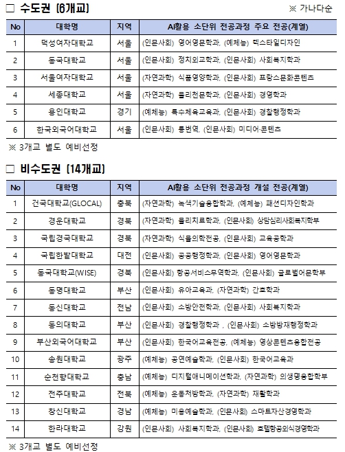 본 사업은 인공지능(AI)이 일상화된 시대에 전공과 관계없이 모든 대학생이 인공지능(AI) 기본 역량을 갖출 수 있도록 대학의 인공지능(AI) 기본교육과정 개발을 지원하는 신규사업이다. 이번 사업은 전공이나 지역 등 여건에 따른 대학 간 인공지능(AI) 교육 격차를 해소하기 위해, 교육부가 별도 지원하는 거점국립대(9개교) 및 과학기술정보통신부가 선정하여 지원 예정인 인공지능 중심대학(10개교)을 제외한 대학 중 20개교를 선정하여 지원한다.