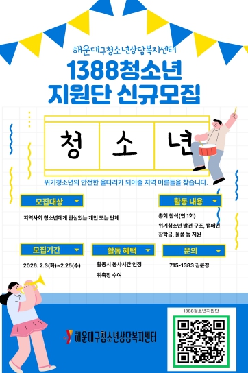[뉴스앤톡] 해운대구 청소년상담복지센터는 지역 내 위기청소년들을 조기에 발견하고 든든한 울타리가 되어줄 ‘1388청소년지원단’을 이달 25일까지 공개 모집한다고 밝혔다.