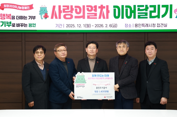 [뉴스앤톡] 용인도시공사는 19일 ‘노사합동 사랑의열차 이어달리기’ 성금 1,400만원을 용인특례시에 기탁했다.