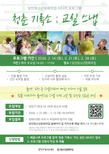 [뉴스앤톡] (재)당진시청소년재단 당진청소년문화의집(관장 유수민)은 오는 2월 14일부터 28일까지 매주 토요일, 14시부터 17시까지 관내 14~19세 청소년을 대상으로 미디어 프로그램 [청춘 기록소 : 교실 스냅]을 운영할 예정이다.